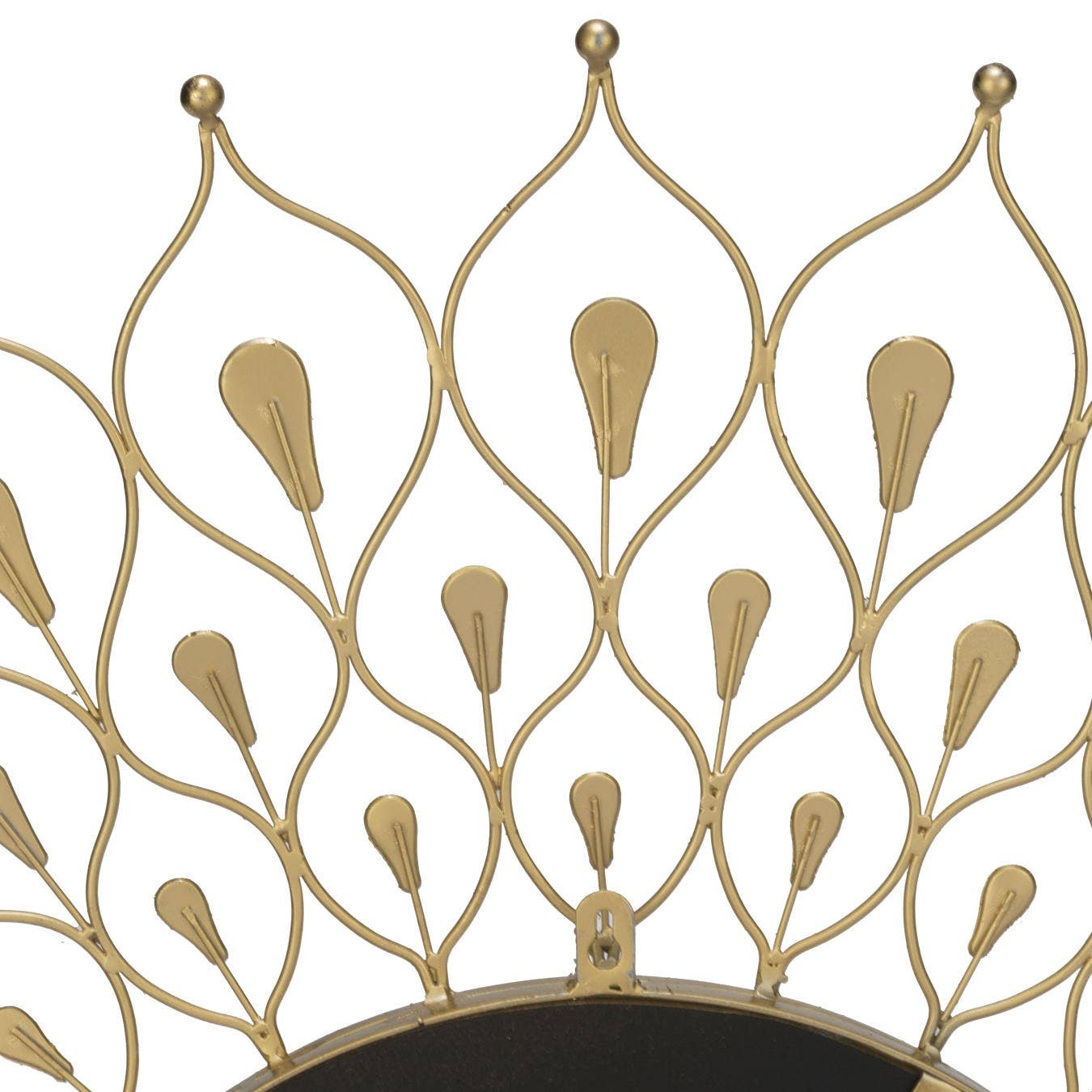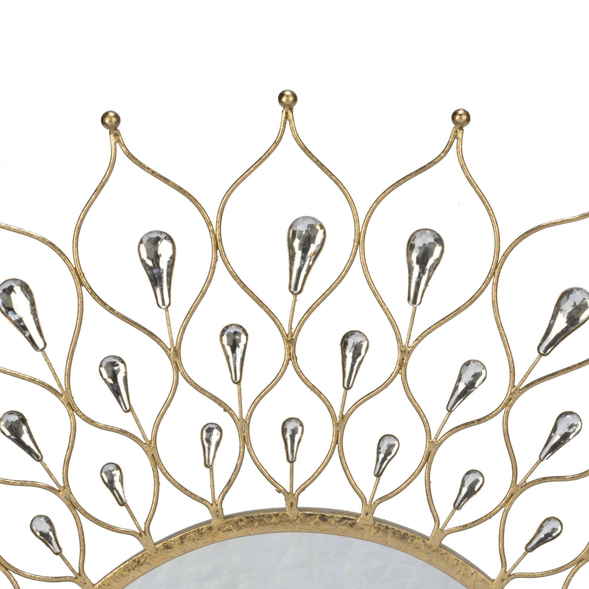 This large bright modern Teardrop Wall Art accent is a beautiful wall piece for any room. The antiqued gold metal finish with 3 layers of stunning acrylic teardrop accents transitions a soft, simple space into a modern environment with a touch of ritz. Mirror features antique gold metal finish. Mirror design includes 3 levels of stunning acrylic teardrop beads - 78 beads in total Center mirror is 13-7/8 inch in diameter. Keyhole on the back for easy hanging. Clean mirror with consumer cleaning solution and frame with a dry microfiber cloth.