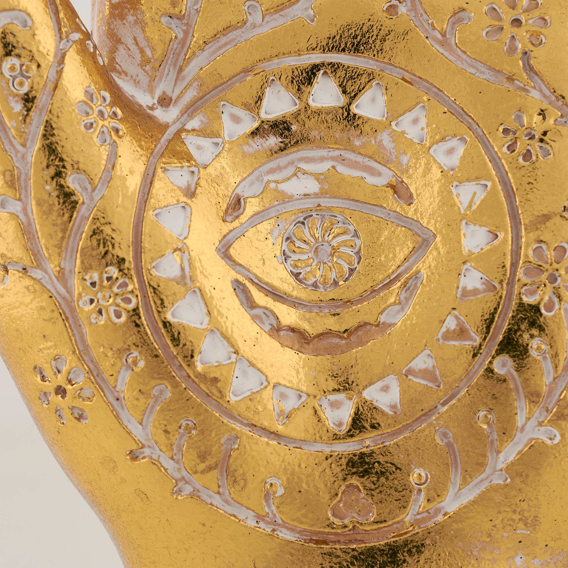 A decorative figurine from our Moody Collection displaying a Hamsa hand inspired design with metallic gold finish and sculpted floral patterns in white. Our Hamsa Hand figurine is designed to free-stand on any flat surface for display. A stylish home accent with a variety of display options.