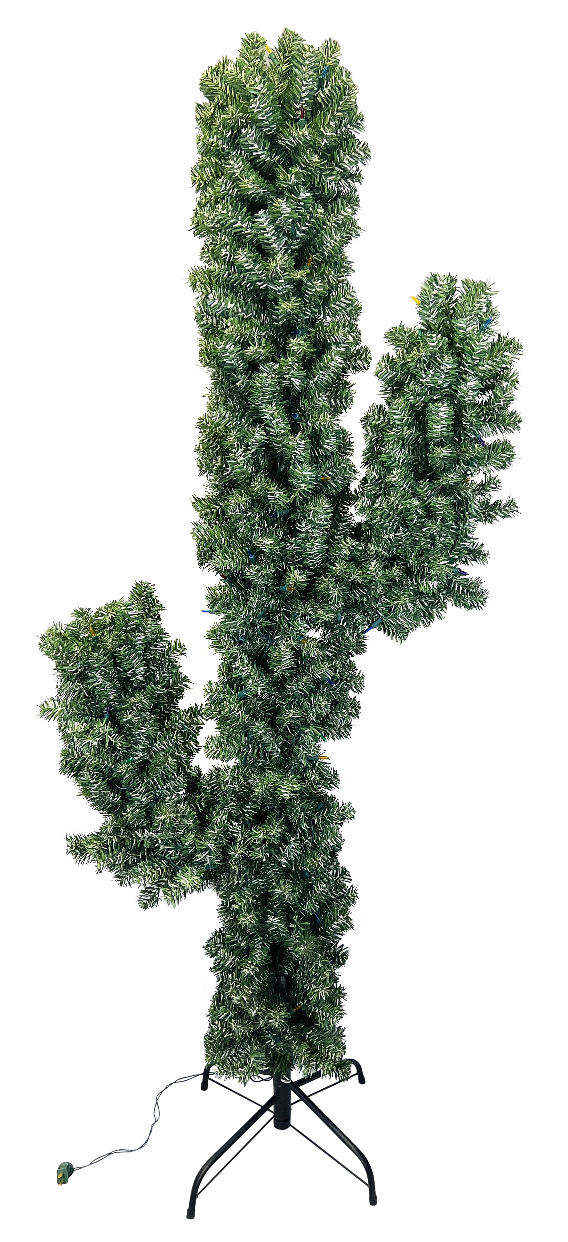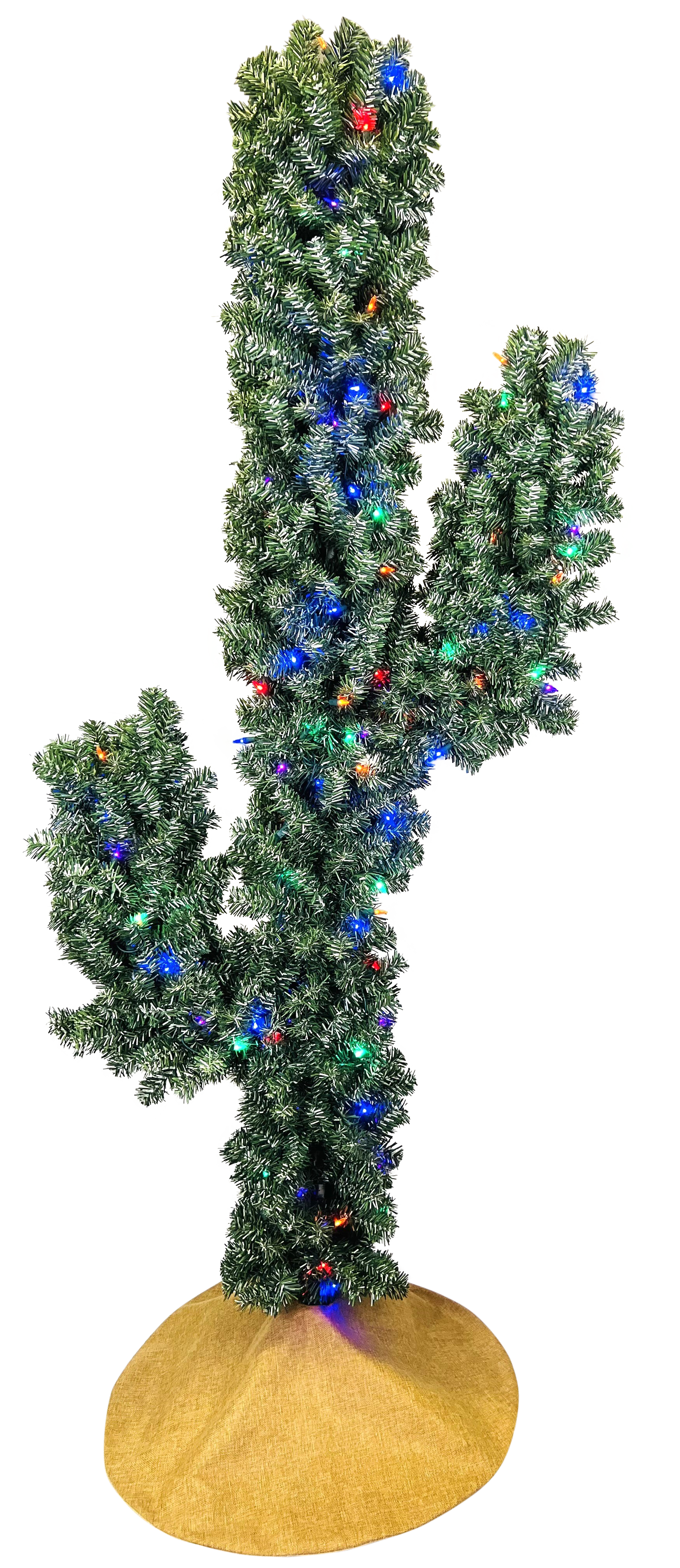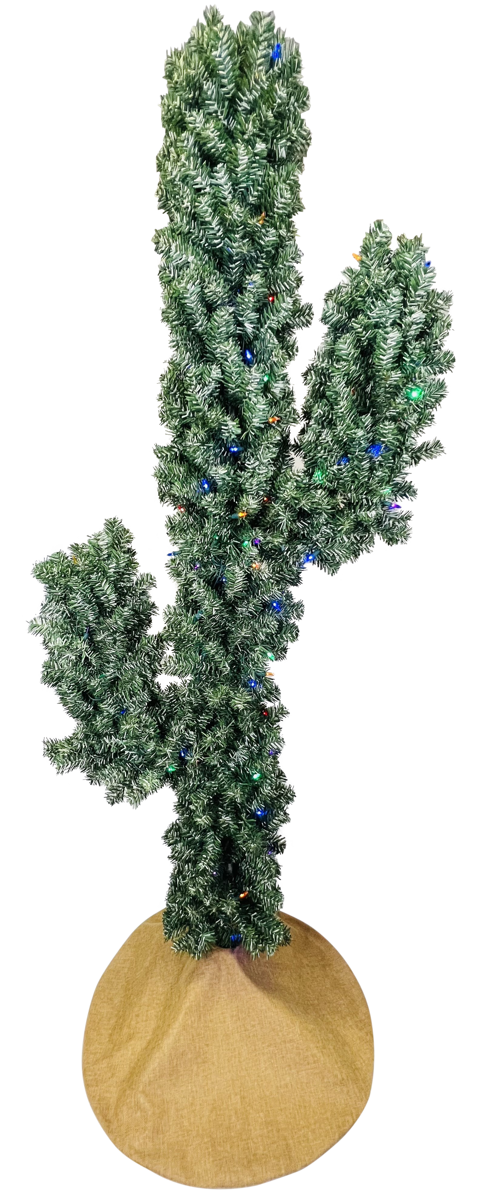 As seen in HGTV Magazine! This fun and unique Cactus Christmas tree has your traditional two branches forming upward. They have white colored leaves mixed in with the green to give a needle effect. Each order comes with a 48" sand colored tree skirt (as seen in the photos). * Each tree comes prelit with 100 colored LED lights (UL Certified). The light string has a plug so you can easily add more lights if you'd like. * These unique trees have a two piece metal structure. The needles are made of PVC. The included four legged stand is made of metal and is secured with hand-tightened screws, making this tree very easy to set up each year.