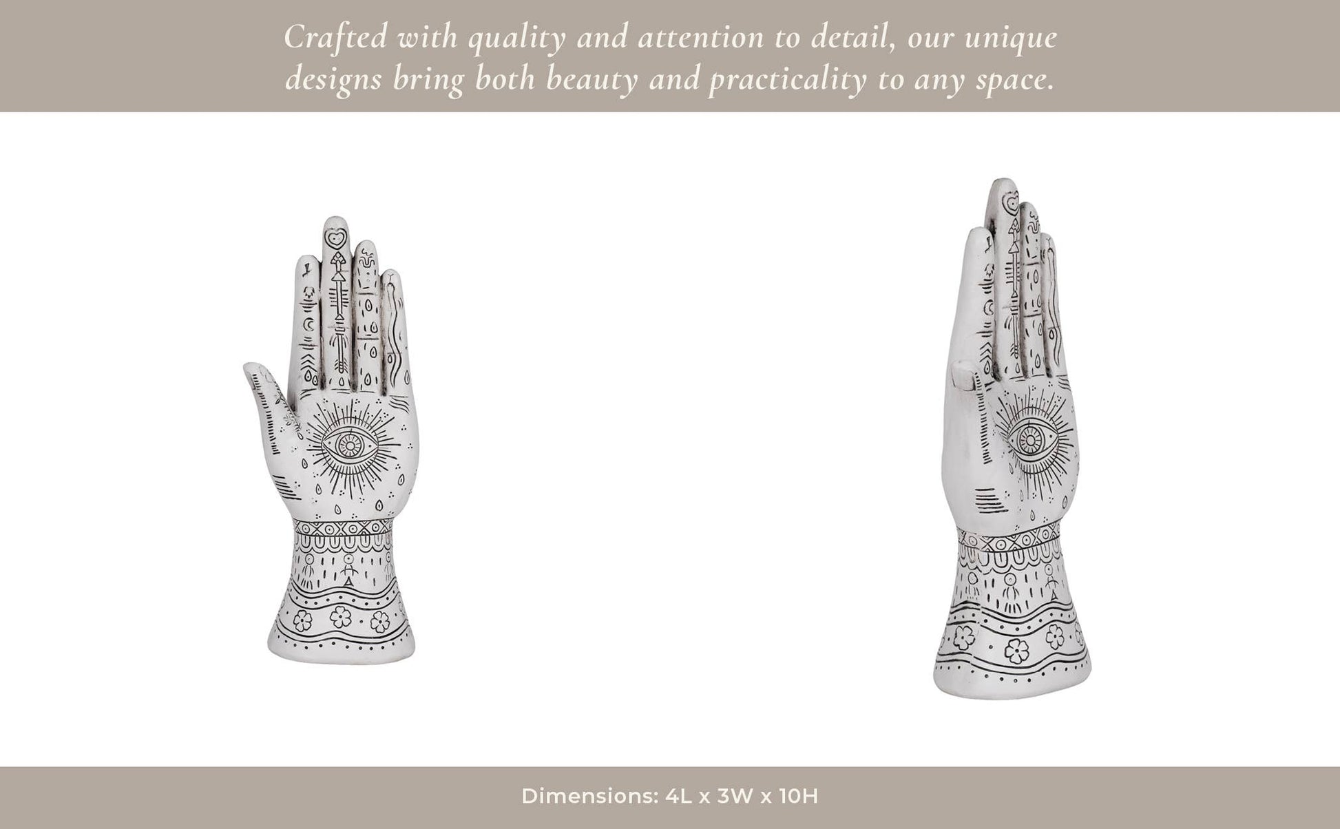 • BOHO-INSPIRED DESIGN - Featuring intricate hand-drawn patterns and a mystical eye motif, this resin hand sculpture adds a touch of spiritual and artistic charm to any space. Its unique aesthetic makes it a conversation starter and a stunning focal point.