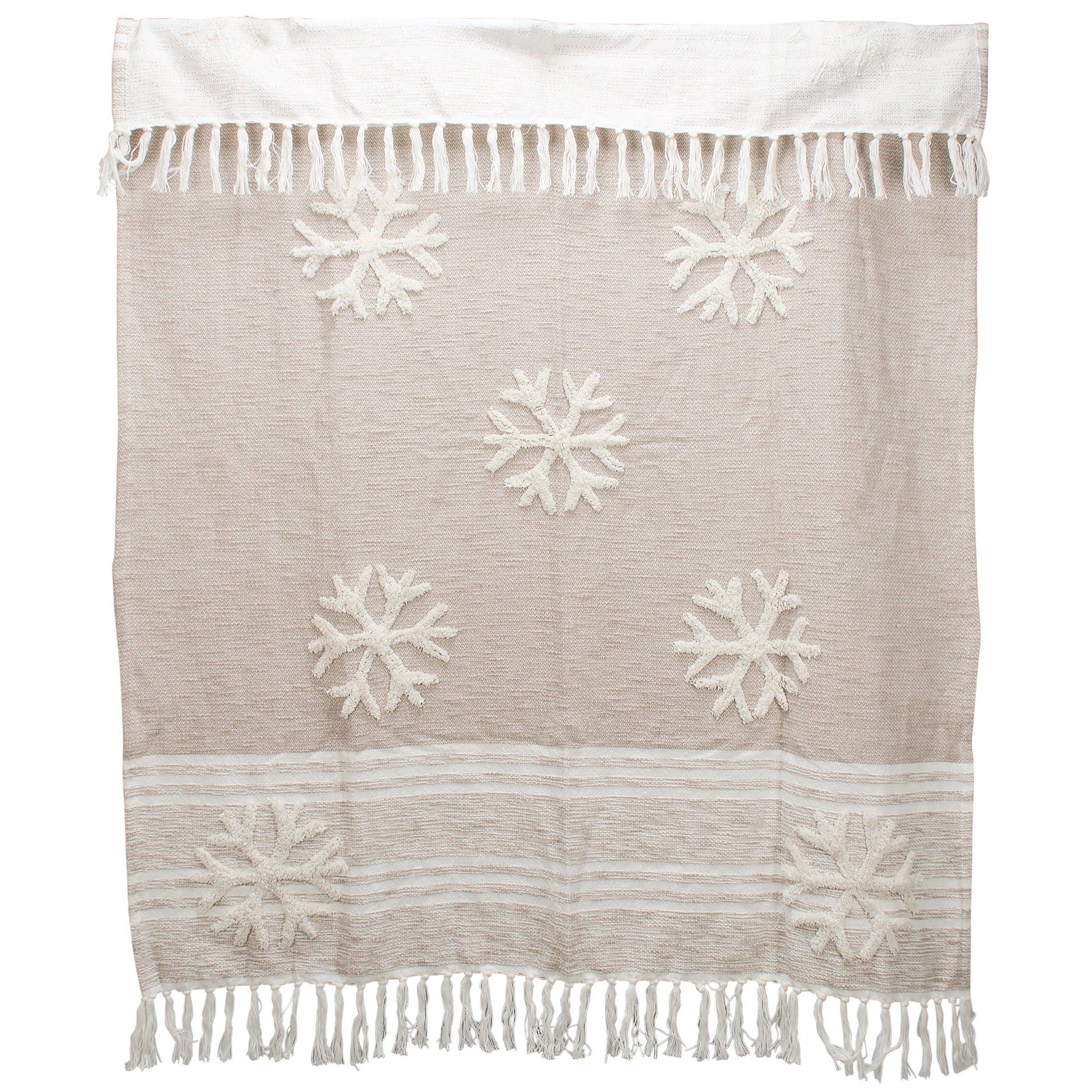 A cotton throw blanket from our Christmas Collection displaying a cream stripe pattern woven throughout with embroidered snowflake designs and coordinating tassels on top and bottom edge. Christmas throw blanket measures 50 x 60 inches giving plenty of coverage to accent furniture or to cozy up under the blanket. Our Snowflakes throw blanket is conveniently machine-washable for easy cleaning. A Christmas home accent perfect for adding seasonal style to any room.