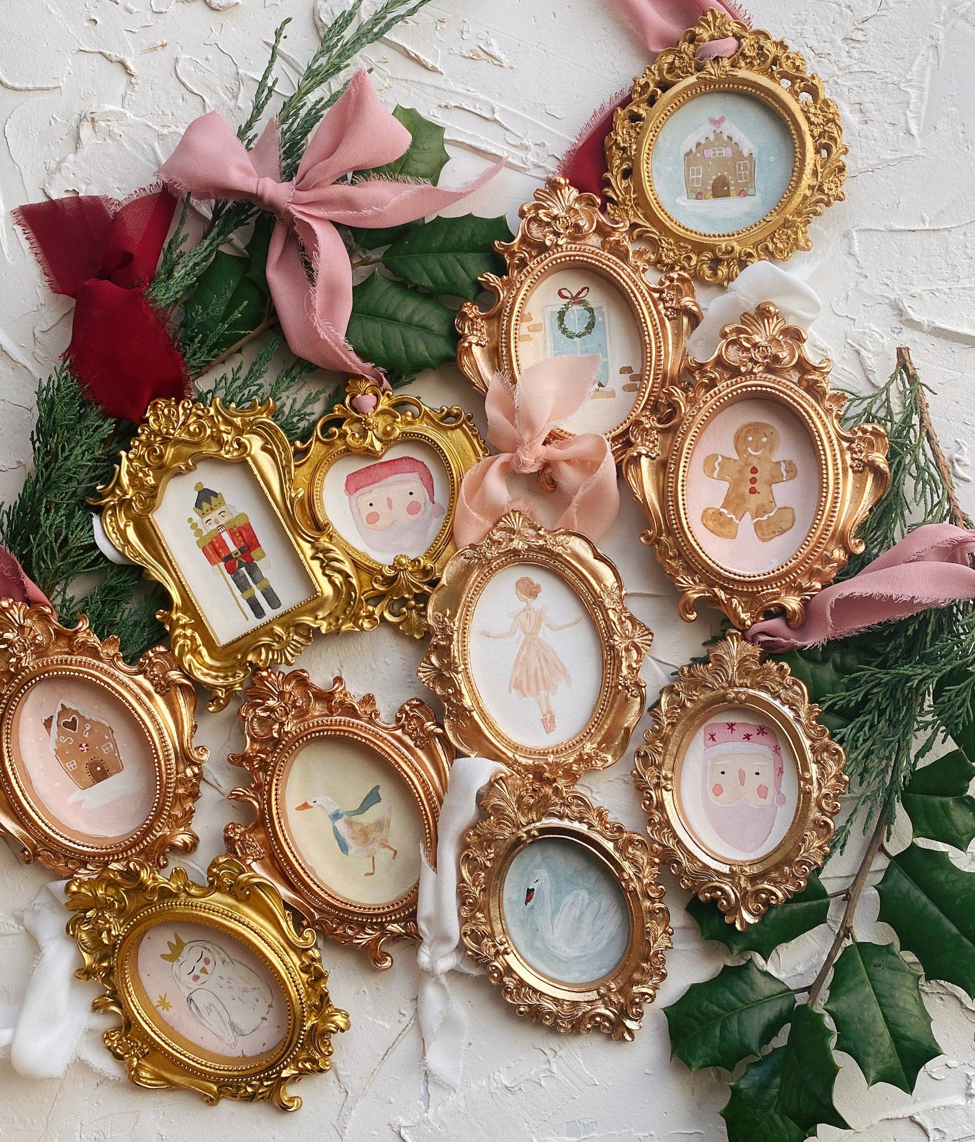 Each measuring under 5 inches, our gold framed ornaments are intended to lend a bit of holiday charm to the home, adding a vintage note to your everyday moments. Hand crafted, these prints are encapsulated in ornate gold frames, with a ribbon for flourish. These can be hung as ornaments, or on walls. These intricate prints lend an artistic touch to gifting, whilst offering elegance and individuality to home decor.